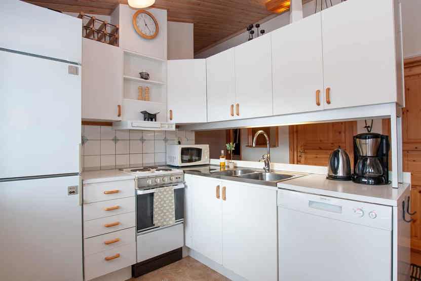 Køkkenet indeholder komfur med ovn, mikro, køleskab med fryser, opvaskemaskine.
