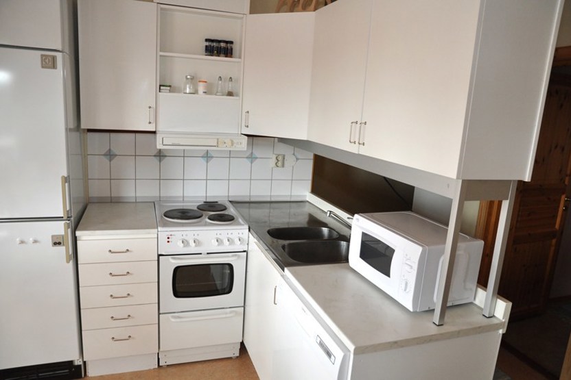 Køkkenet indeholder komfur med ovn, mikro, køleskab med fryser, opvaskemaskine.