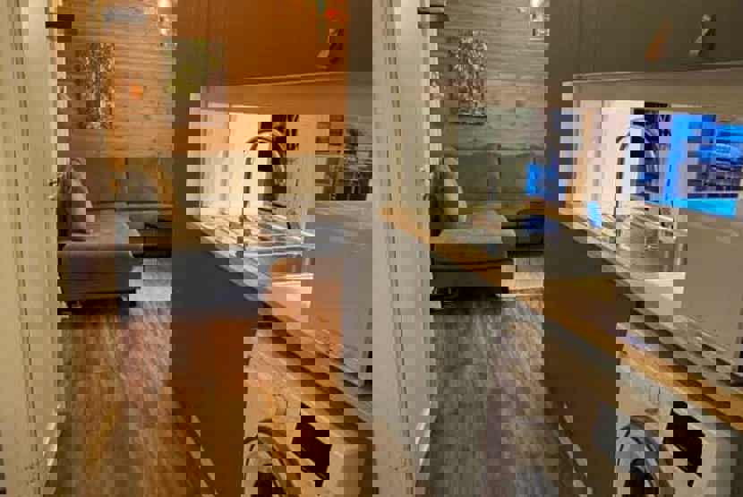 Stue med TV, lille køkkenafdeling.