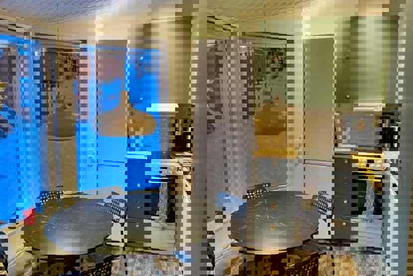 Køkkenet indeholder komfur med ovn, mikro, køleskab med fryser, opvaskemaskine.