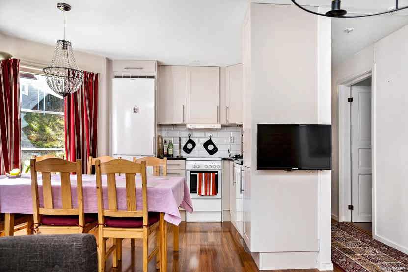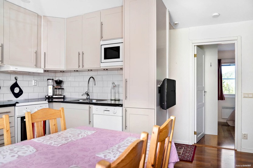 Køkkenet indeholder komfur med ovn, mikro, køleskab med fryser, opvaskemaskine.