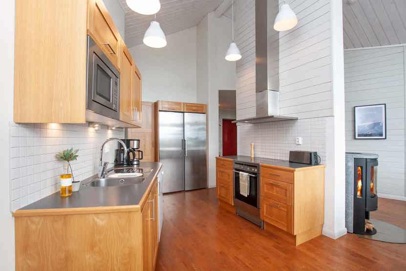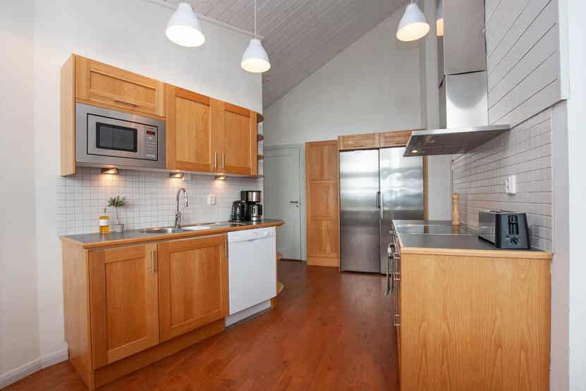 Køkkenet indeholder komfur med ovn, mikro, køleskab med fryser, opvaskemaskine.