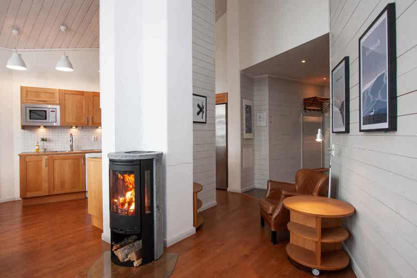 Stue med TV, lille køkkenafdeling, brændeovn (brænde indgår ikke).