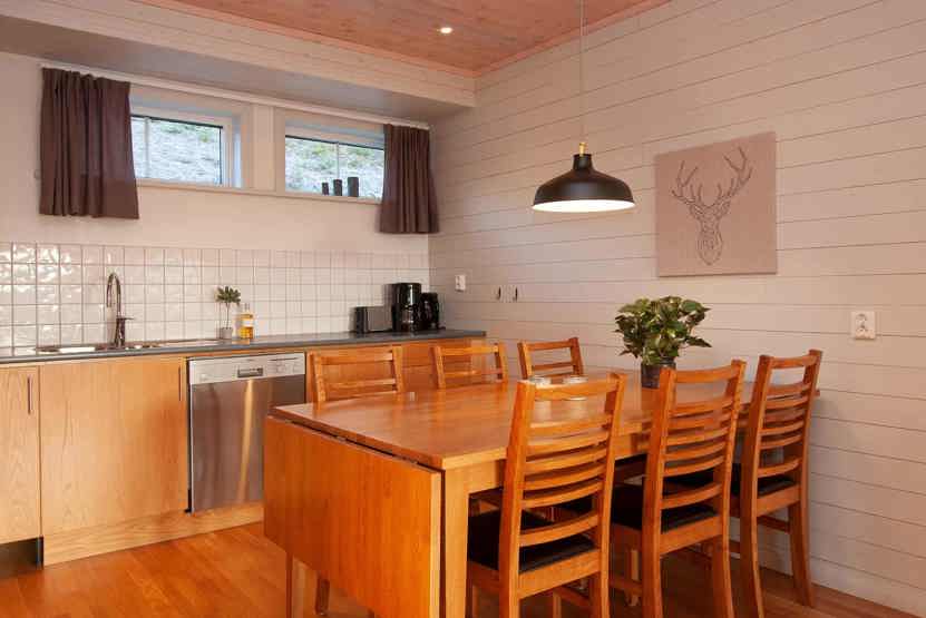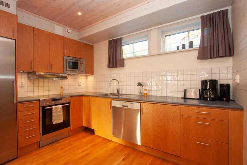 Køkkenet indeholder komfur med ovn, mikro, køleskab med fryser, opvaskemaskine.