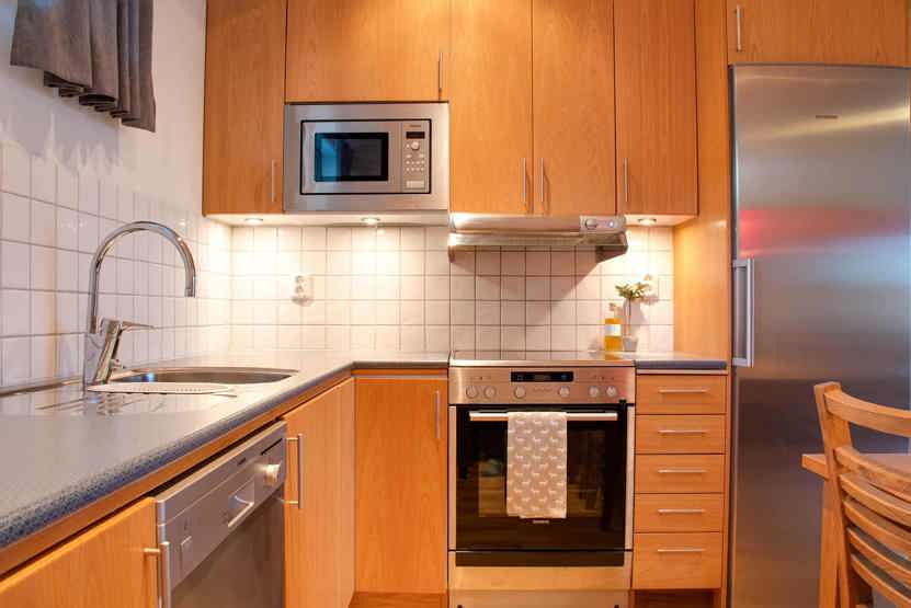 Køkkenet indeholder komfur med ovn, mikro, køleskab med fryser, opvaskemaskine.