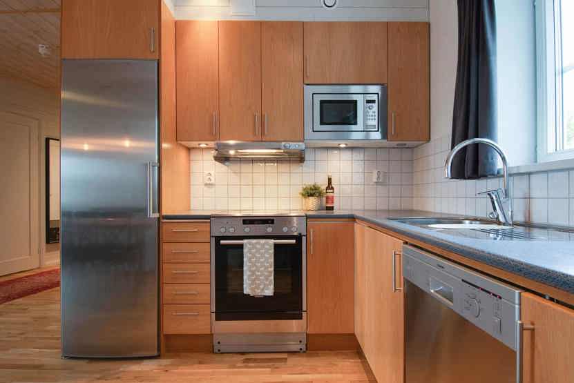 Køkkenet indeholder komfur med ovn, mikro, køleskab med fryser, opvaskemaskine.