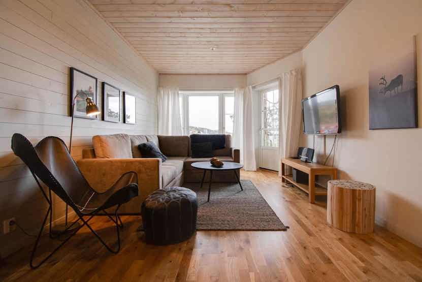 Stue med TV, lille køkkenafdeling, sovesofa.