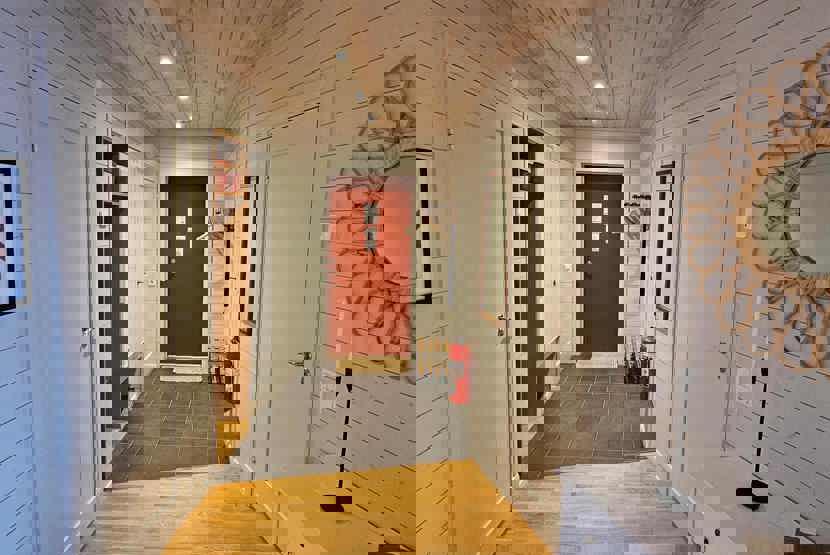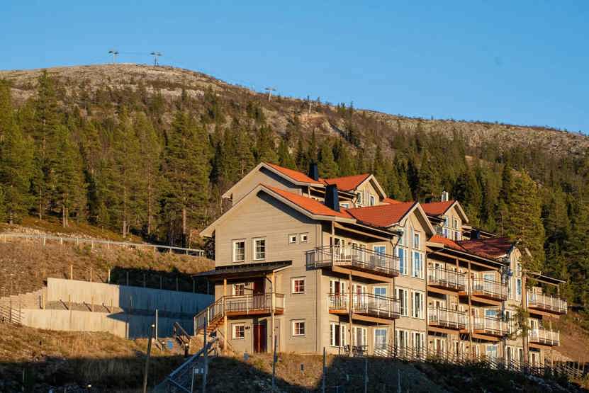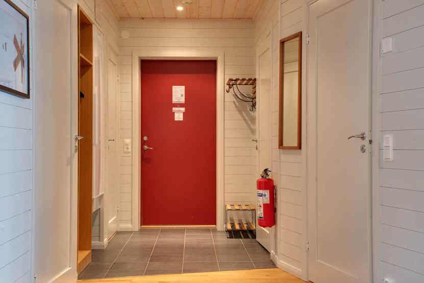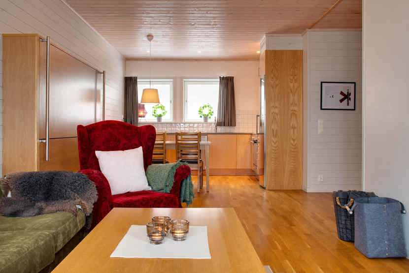 sengeskab i alrummet, tørreskab, skiopbevaring, balkon/altan (der skovles ikke sne), med en fælles indgang, og en trappe, 1 parkeringsplads, adgang til elbilopladere med type 2 stik mod betaling.
