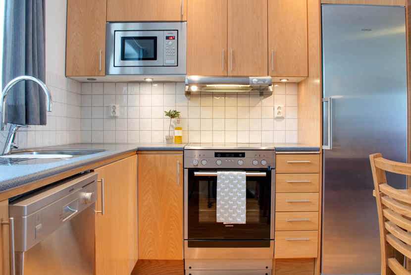Køkkenet indeholder komfur med ovn, mikro, køleskab med fryser, opvaskemaskine.