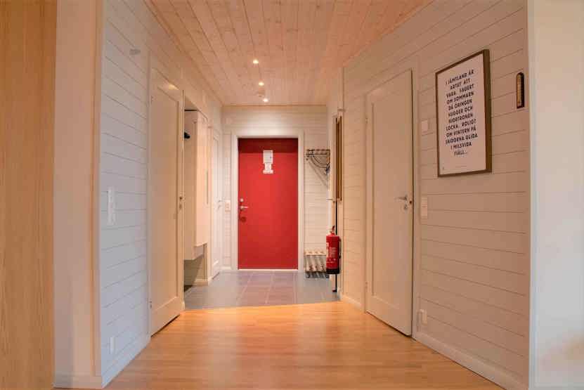 sengeskab i alrummet, tørreskab, skiopbevaring, balkon/altan (der skovles ikke sne), med en fælles indgang, og en trappe, 1 parkeringsplads, adgang til elbilopladere med type 2 stik mod betaling.