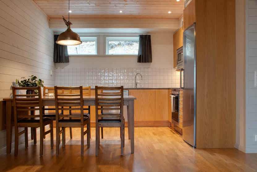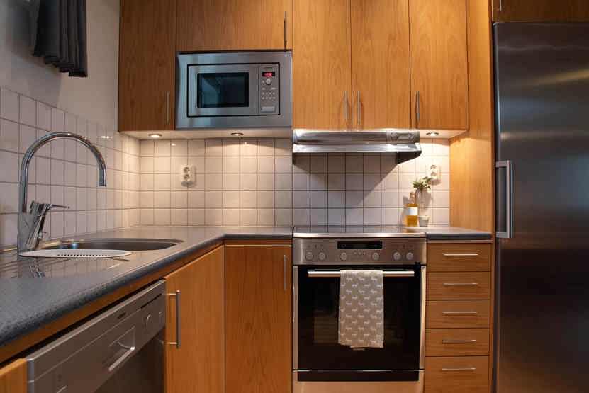 Køkkenet indeholder komfur med ovn, mikro, køleskab med fryser, opvaskemaskine.