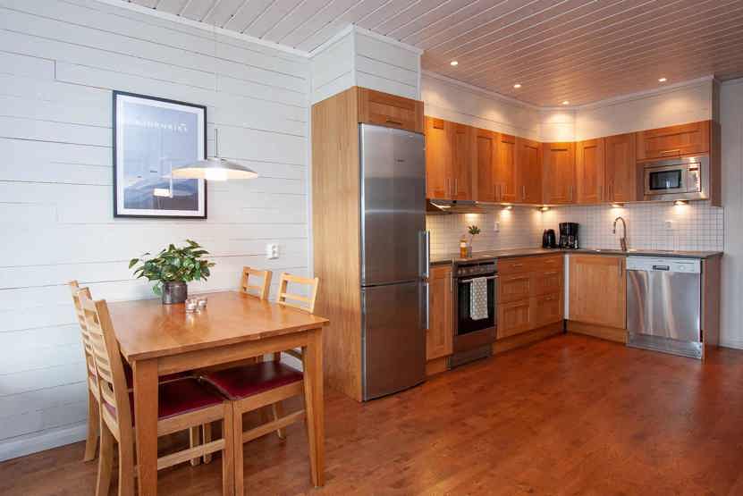 Køkkenet indeholder komfur med ovn, køleskab med fryser, opvaskemaskine, mikro.