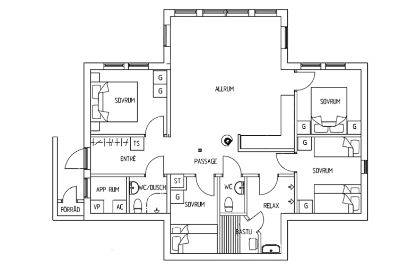 Soveværelse-1 = 1 dobbeltseng. Soveværelse-2 = 1 dobbeltseng. Soveværelse-3 = 1 køjeseng med 120 cm bred underkøje. Soveværelse-4 = 1 køjeseng, 1 køjeseng med 120 cm bred underkøje.