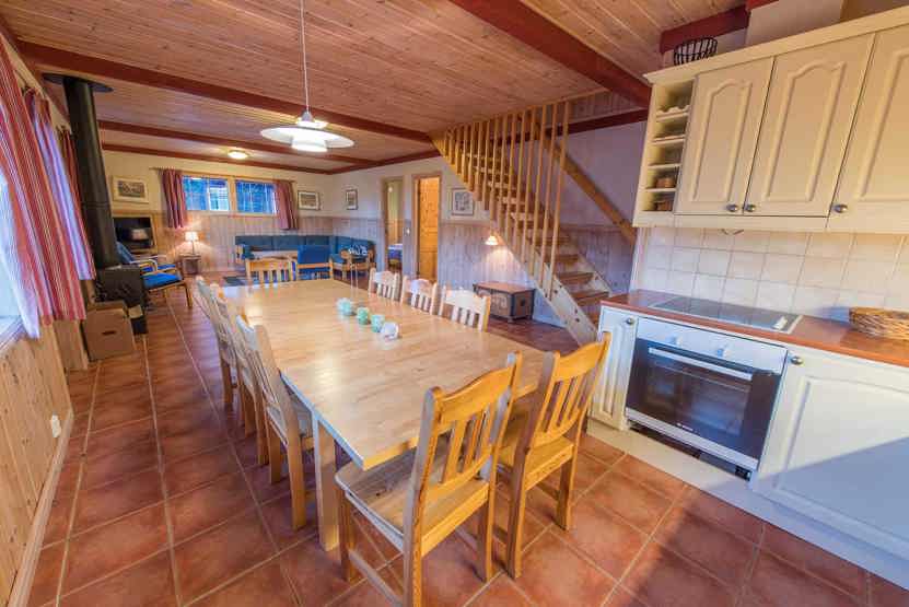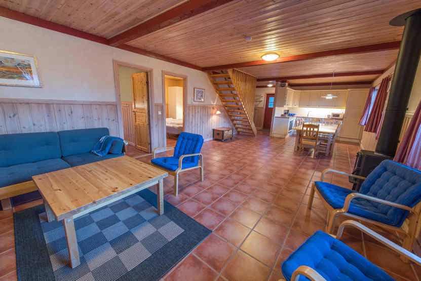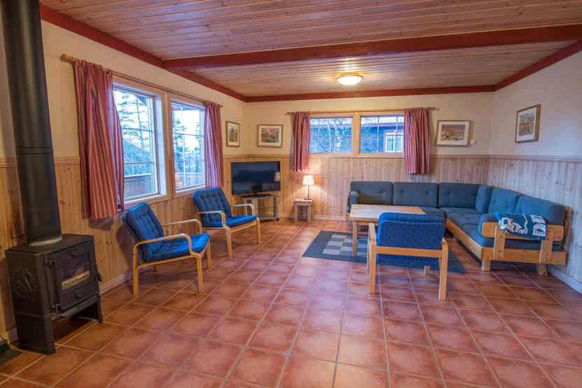 Stue med TV, lille køkkenafdeling, brændeovn (brænde indgår ikke).