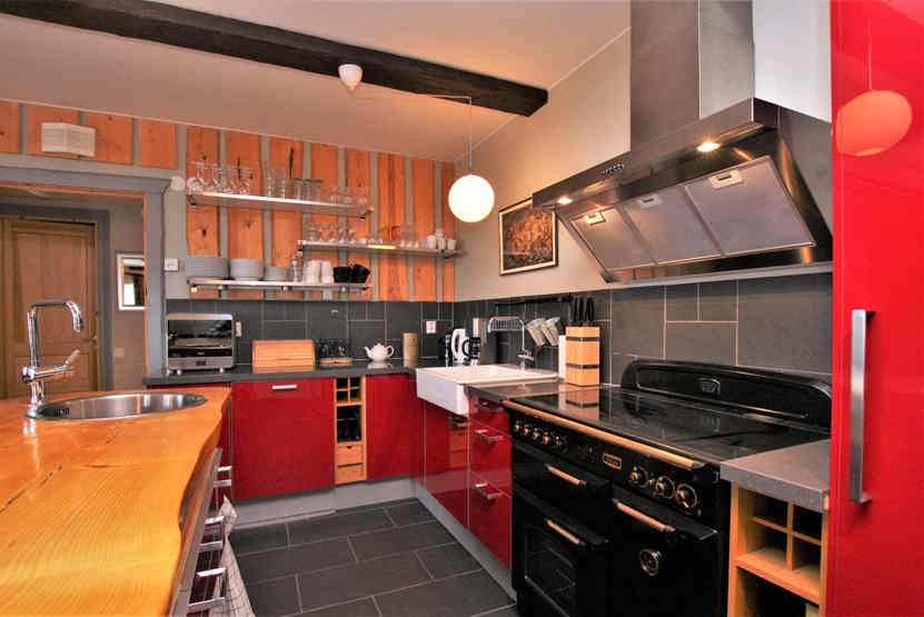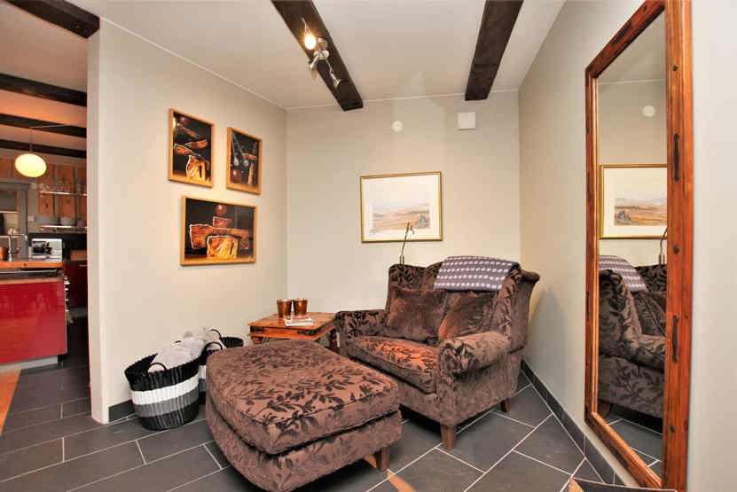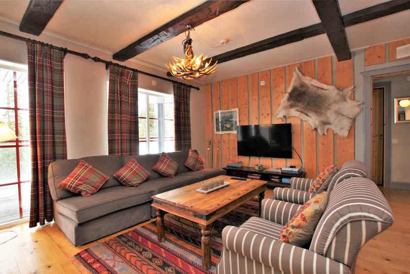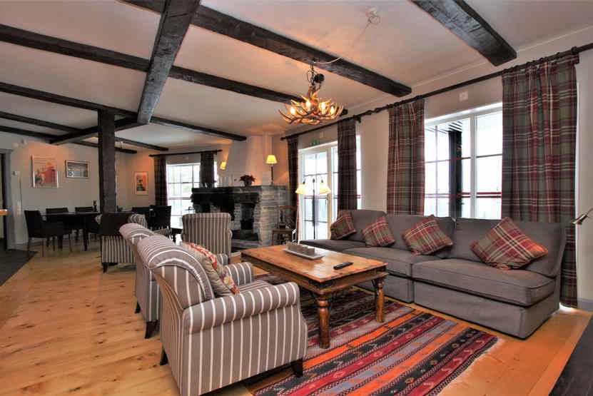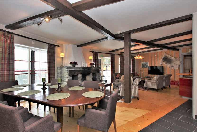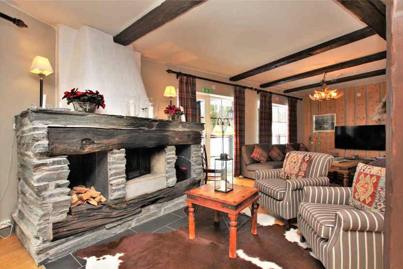 Stue med åben pejs (brænde indgår ikke), TV, lille køkkenafdeling.