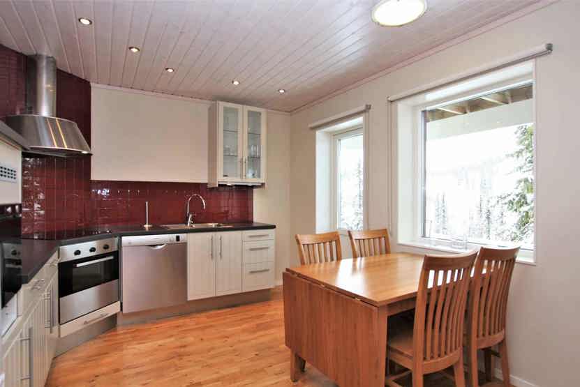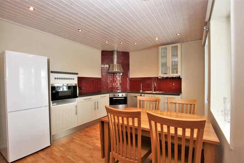 Køkkenet indeholder komfur med ovn, mikro, køleskab med fryser, opvaskemaskine.