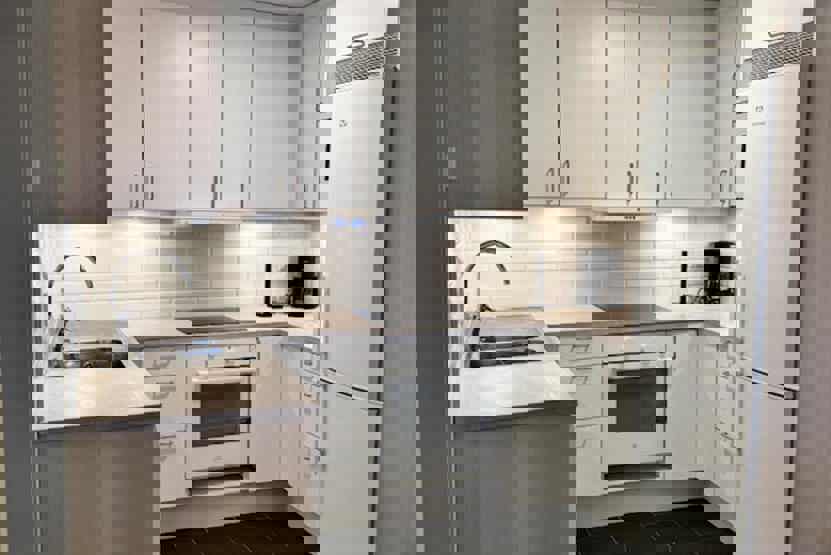 Køkkenet indeholder komfur med ovn, køleskab med fryser, opvaskemaskine, mikro.