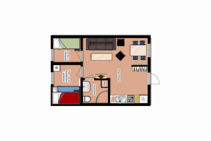 Soveværelse-1 = 1 køjeseng. Soveværelse-2 = 1 køjeseng med 120 cm bred underkøje.