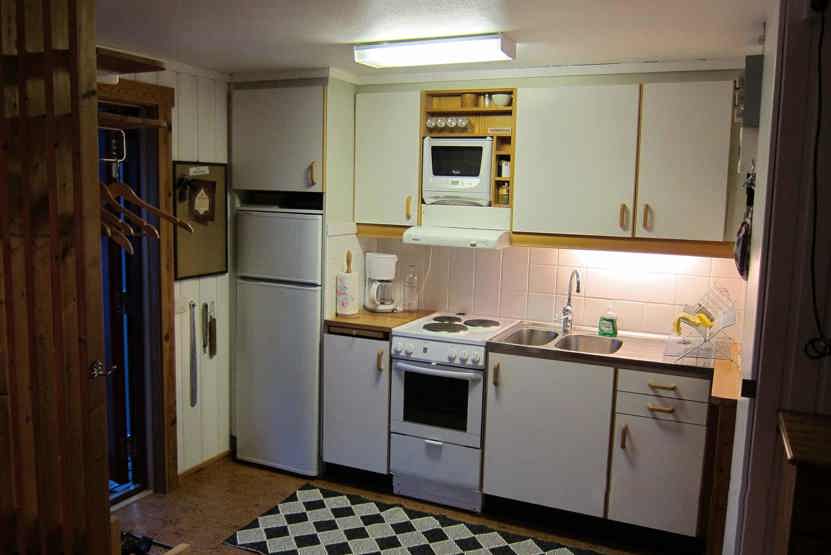 Køkkenet indeholder komfur med ovn, mikro, køleskab med en lille fryser (ca 40L).