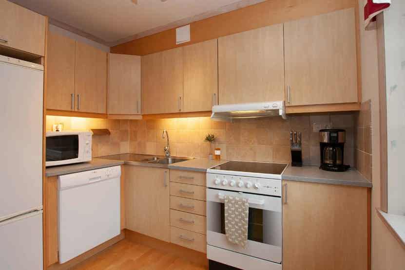 Køkkenet indeholder komfur med ovn, køleskab med fryser, opvaskemaskine, mikro.