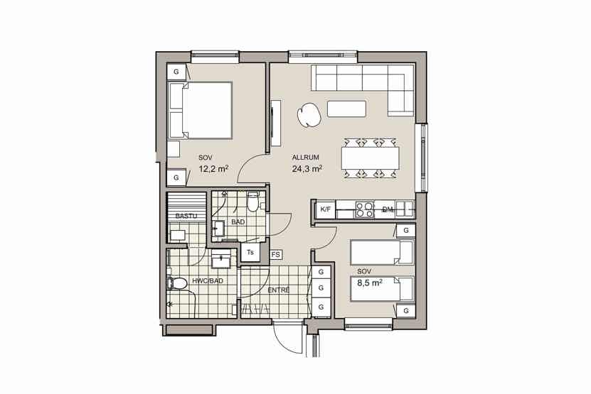 Badeværelse 1 = bruser/WC/sauna. Badeværelse 2 = bruser/WC.