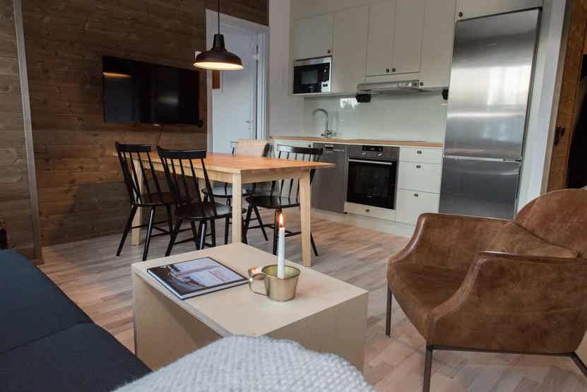 Køkkenet indeholder ovn, mikro, køleskab med fryser, komfur, opvaskemaskine.