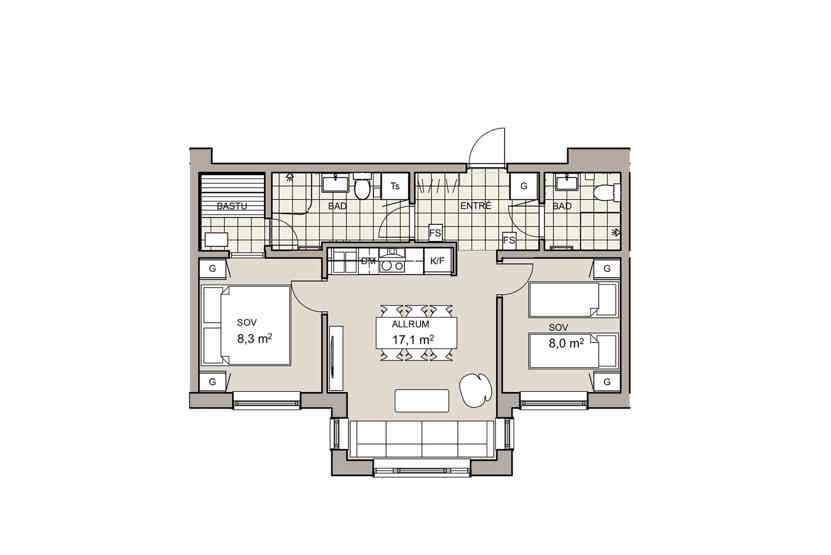 Badeværelse 1 = bruser/WC/sauna. Badeværelse 2 = bruser/WC.