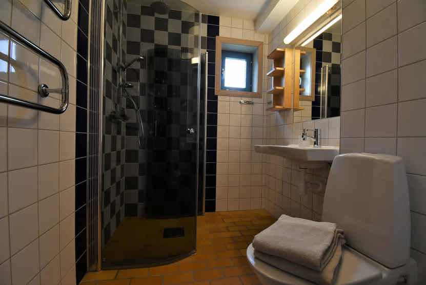Badeværelse 1 = bruser/WC. Badeværelse 2 = wc. Badeværelse 3 = relaxafdeling med sauna, 2 st brusere og WC. Badeværelse 4 = bruser/WC.