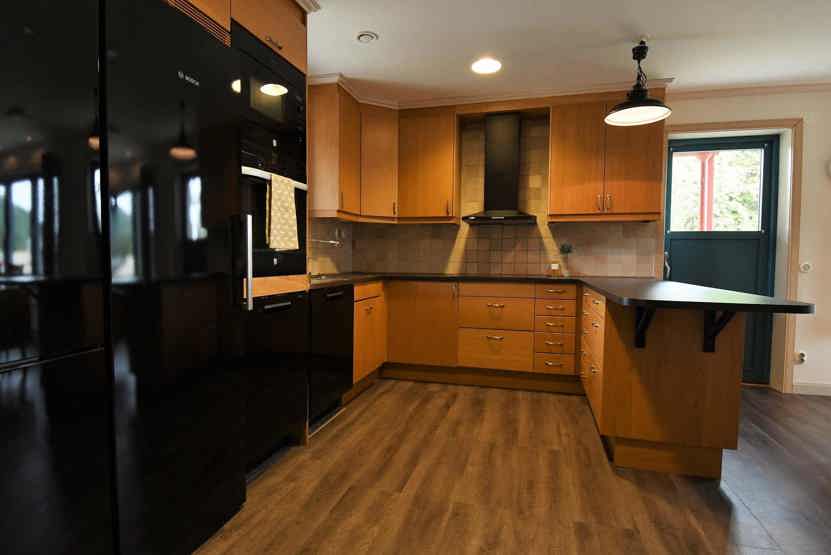 Køkkenet indeholder komfur med ovn, køleskab med fryser, opvaskemaskine, mikro, TV.