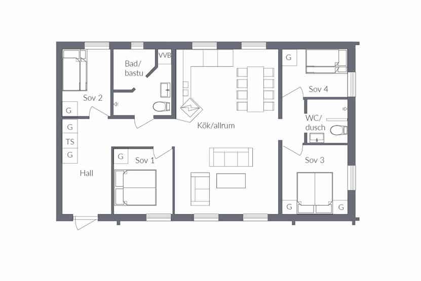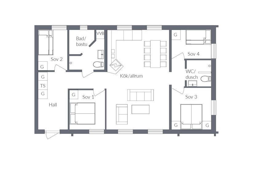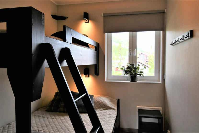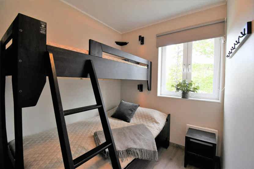 Soveværelse-1 = 1 dobbeltseng. Soveværelse-2 = 1 dobbeltseng. Soveværelse-3 = 1 køjeseng med 120 cm bred underkøje. Soveværelse-4 = 1 køjeseng med 120 cm bred underkøje.