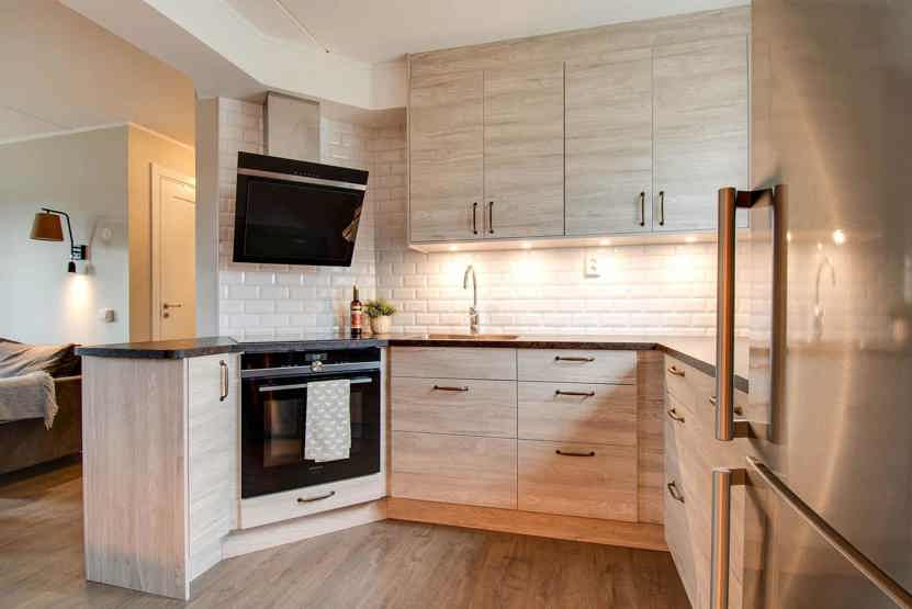 Stue med TV, lille køkkenafdeling.