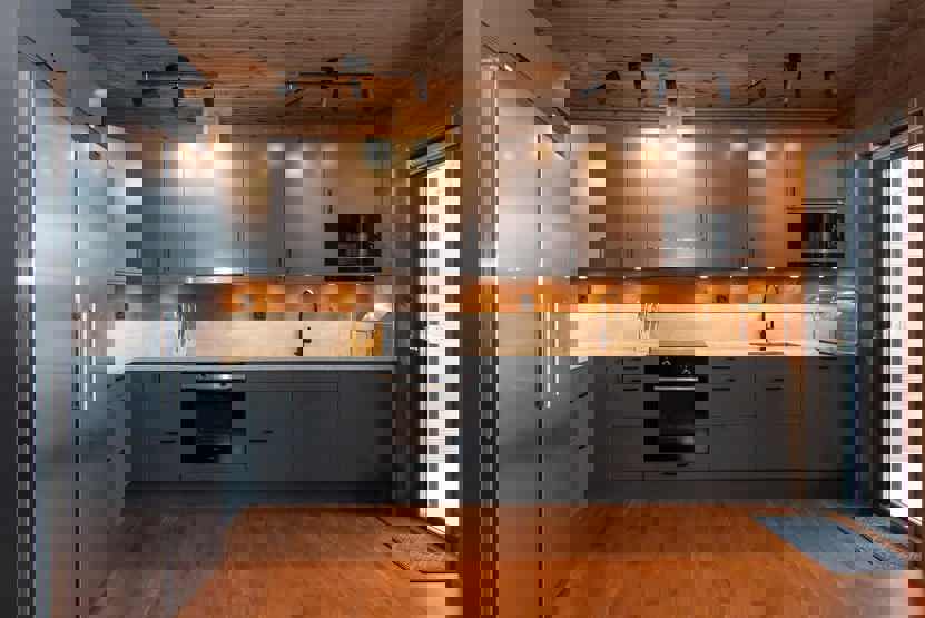 Køkkenet indeholder komfur, ovn, køleskab, fryser, opvaskemaskine, mikro.