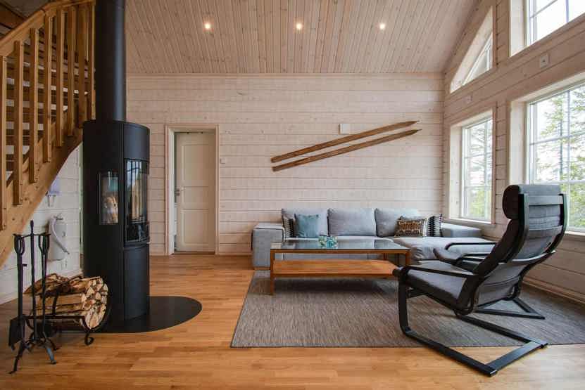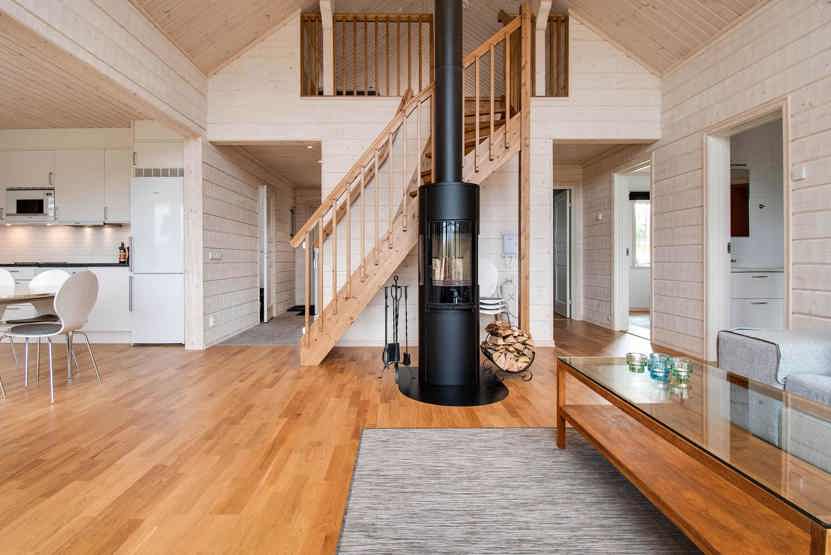 Stue med lille køkkenafdeling, brændeovn (brænde indgår ikke).
