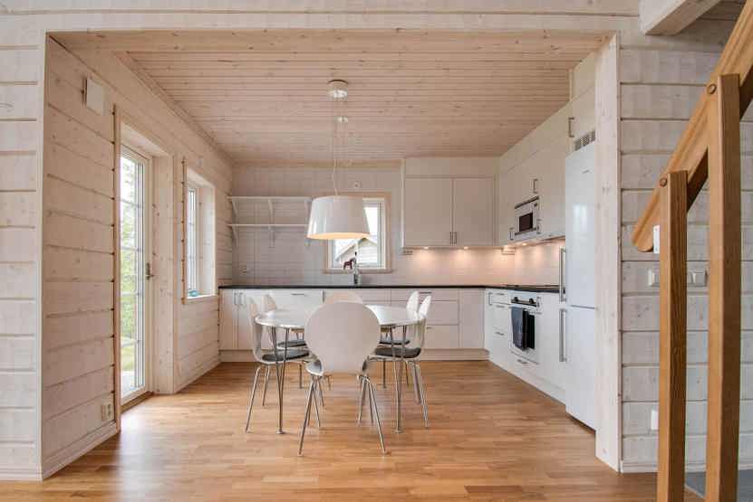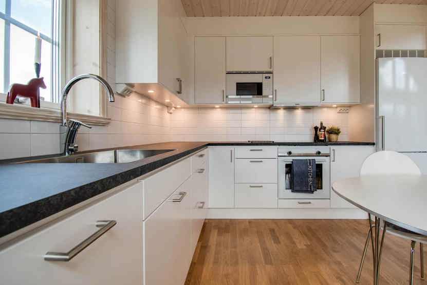 Køkkenet indeholder komfur, ovn, køleskab, fryser, opvaskemaskine, mikro.