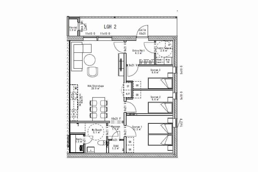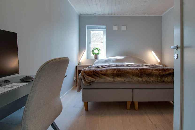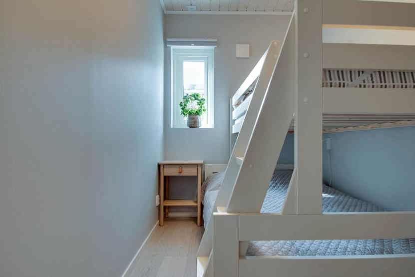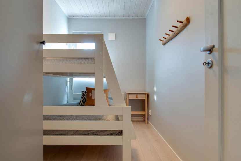 Soveværelse-1 = 1 dobbeltseng 180 cm bred. Soveværelse-2 = 1 køyeseng med 120 cm bred underkøye og 90 cm bred overkøye. Soveværelse-3 = 1 køyeseng med 120 cm bred underkøye og 90 cm bred overkøye.