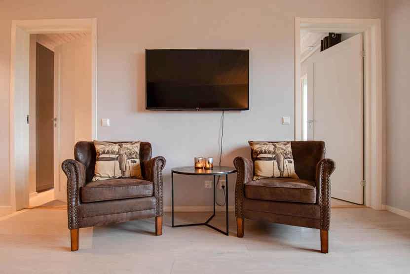 Stue med TV, lille køkkenafdeling.