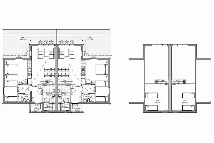 Badeværelse 1 = bruser/WC/sauna. Badeværelse 2 = bruser/WC.