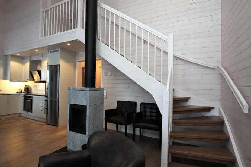 Stue med lille køkkenafdeling, TV, brændeovn (brænde indgår ikke).
