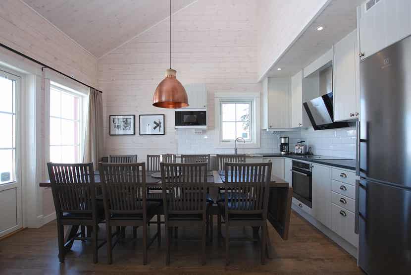 Køkkenet indeholder komfur, ovn, køleskab med fryser, opvaskemaskine, mikro.