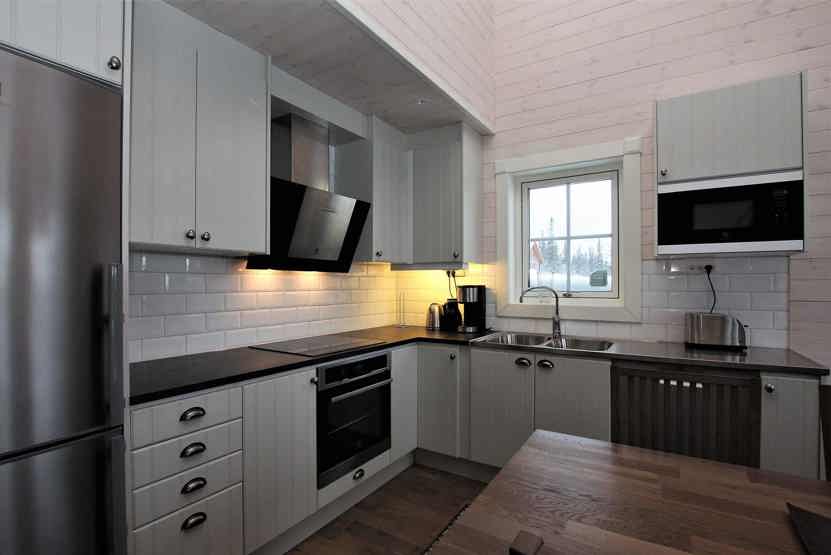 Køkkenet indeholder komfur, ovn, køleskab med fryser, opvaskemaskine, mikro.