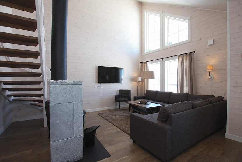 Stue med lille køkkenafdeling, TV, brændeovn (brænde indgår ikke).