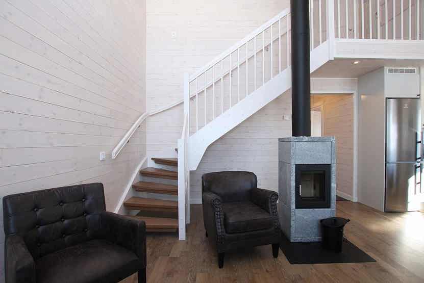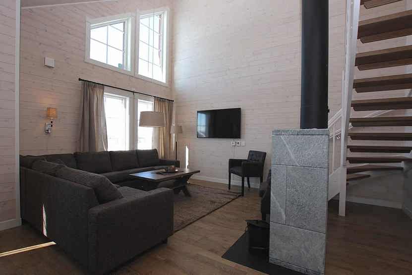 Stue med lille køkkenafdeling, TV, brændeovn (brænde indgår ikke).
