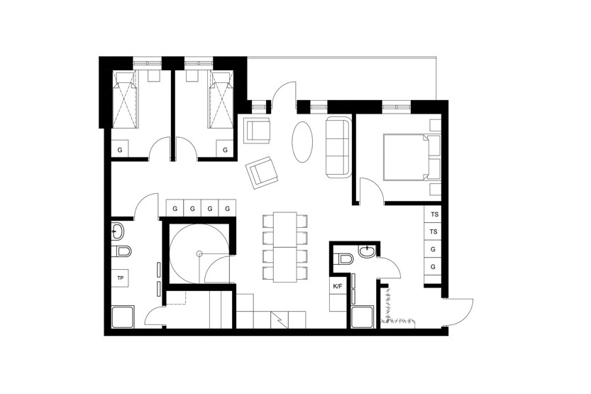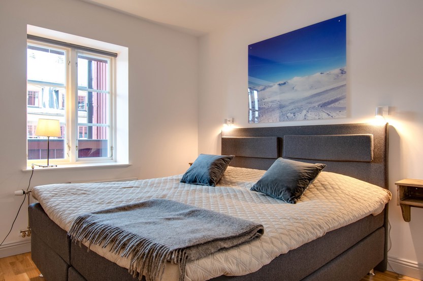 Skalets torg, Sporthuset ligger i Vemdalsskalet. Lejlighed, Placeret på 2. etage, 6 sengepladser, 90 kvm, alrum med køkkenafdeling, 3 soveværelse, 2 brusere, 2 WC, sauna.