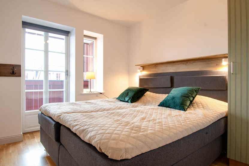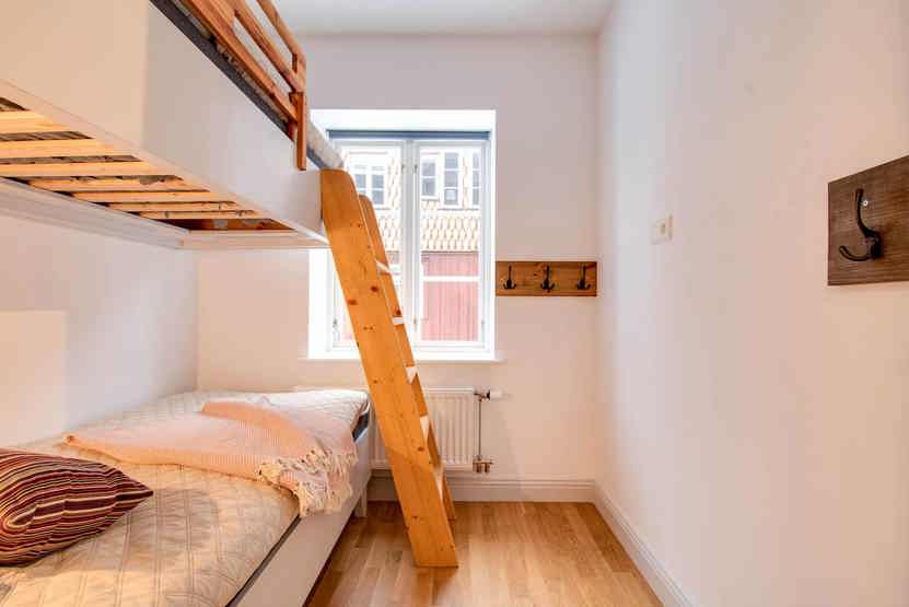 Soveværelse-1 = 1 dobbeltseng. Soveværelse-2 = 1 dobbeltseng. Soveværelse-3 = 1 dobbeltseng. Soveværelse-4 = 1 dobbeltseng. Soveværelse-5 = 1 køjeseng med 90 cm bred underkøje og 80 cm bred overkøje.