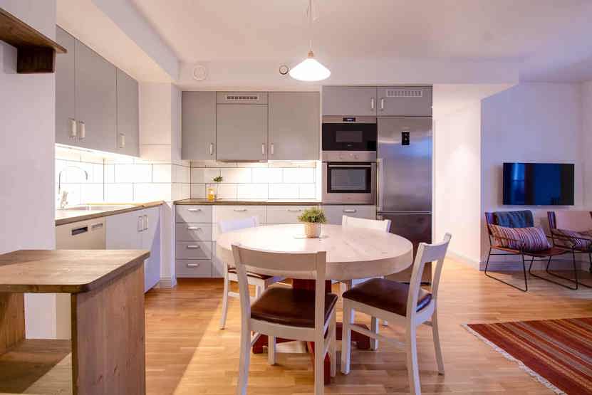 Køkkenet indeholder komfur, ovn, køleskab med fryser, opvaskemaskine, mikro.