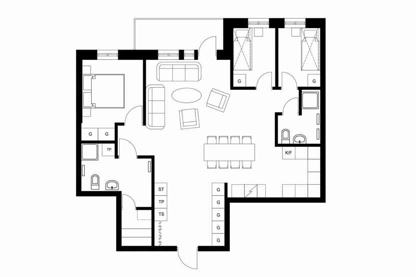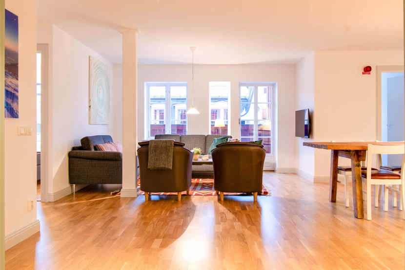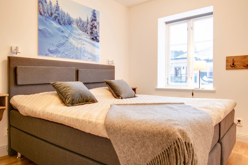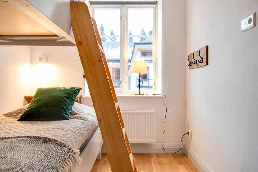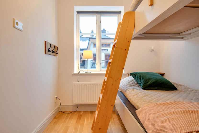 Skalets torg, Sporthuset ligger i Vemdalsskalet. Lejlighed, Placeret på 3. etage, 6 sengepladser, 91 kvm, alrum med køkkenafdeling, 3 soveværelse, 2 brusere, 2 WC, sauna.