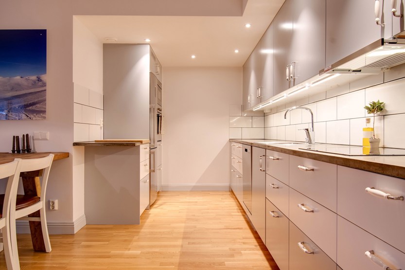 Køkkenet indeholder komfur, ovn, køleskab med fryser, opvaskemaskine, mikro.
