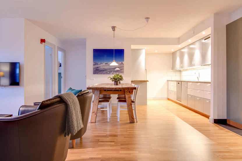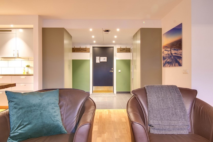 vaskemaskine, tørreskab, balkon (der skovles ikke sne), skiopbevaring, med en fælles indgang, elevator findes i huset, 2 parkeringspladser.