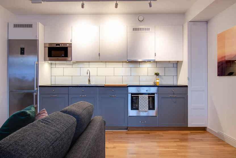 Køkkenet indeholder komfur, ovn, køleskab med fryser, opvaskemaskine, mikro.