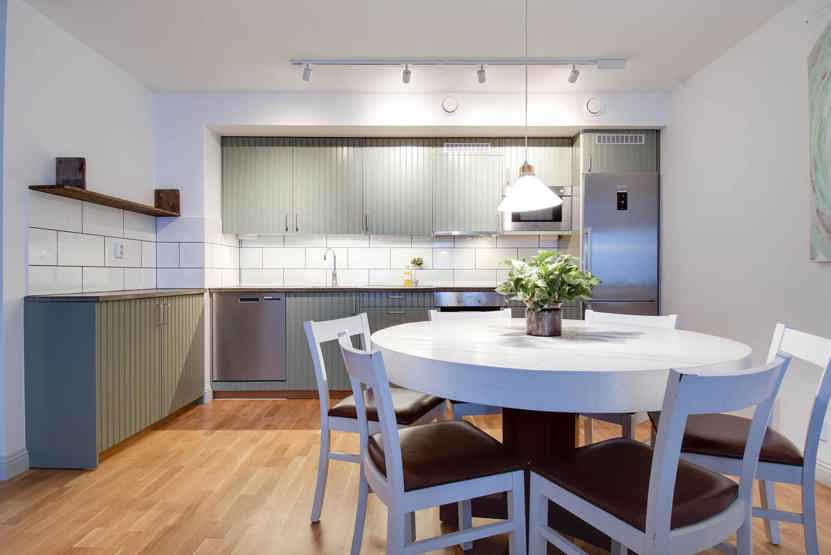 Køkkenet indeholder komfur, ovn, køleskab med fryser, opvaskemaskine, mikro.